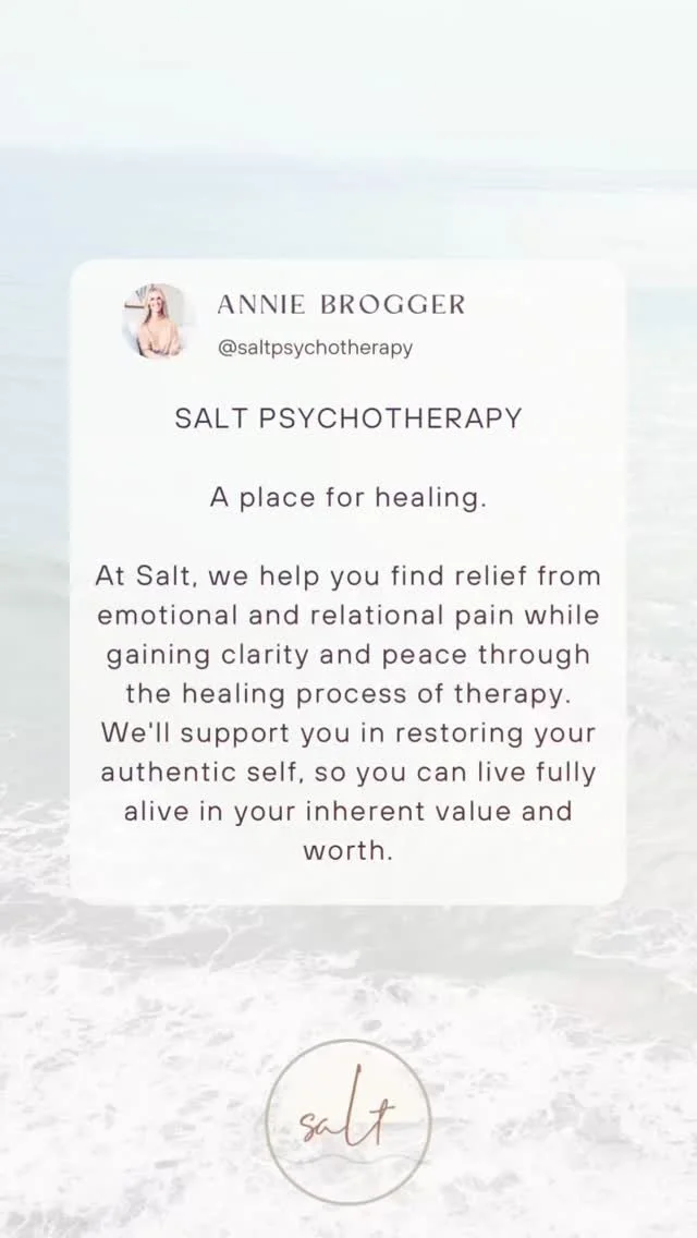 Whether you’re swimming in our ocean water, or shedding cleansing tears, salt has always been healing. In ancient days, salt was used medicinally for the healing of wounds; we hope to carry that tradition forward in a symbolic way. We are here to come alongside you and work together to mend your heart, mind, and soul. We are a group of down-to-earth, authentic, and kind therapists who love to see our clients transform their hurts into wholeness, the worn-out parts back to life again.